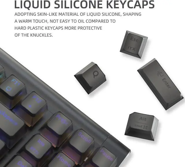 Comfortable Liquid Silicone KeycapsMT87 keycaps are made of skin-like material, which is gentle to the touch and not easy to oil, and can effectively protect your knuckles compared to hard plastic keycaps.