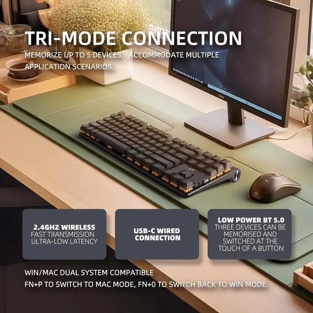 Tri-mode Connection & Large 10000 mAh Battery CapacityConfigured with tri-mode connectivity technology, supports USB-C wired, BT 5.0 and 2.4Ghz wireless modes, and can memorize up to 5 devices. Meanwhile, it is equipped with 10000 mAh battery capacity which is more than twice of the conventional one, so you can get rid of the battery life trouble.