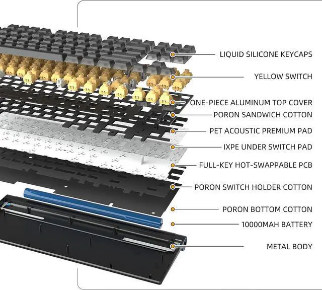 High Performance Yellow SwitchThis wireless mechanical keyboard features full POM switches,better enhances oxidation resistance and sensitivity, press shake becomes less, making the mechanical life longer, more responsive and precise.