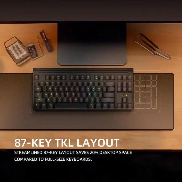 Compact 87-key design & Special Research Integrated StructureThis mechanical keyboard with 87-key streamlined layout saves 20% desktop space compared to full-size keyboards. The precision manufactured aluminum alloy positioning plate is integrated with the top cover to make the key consistency S-grade.