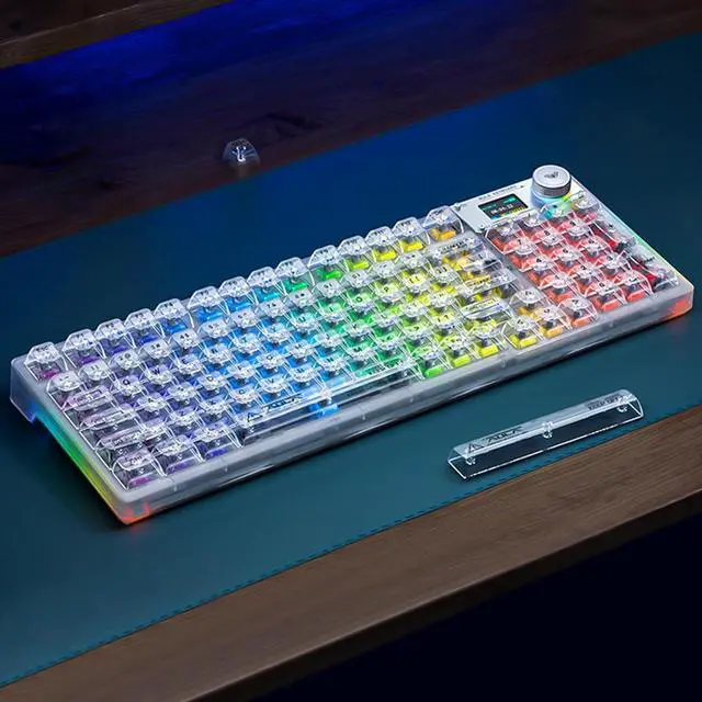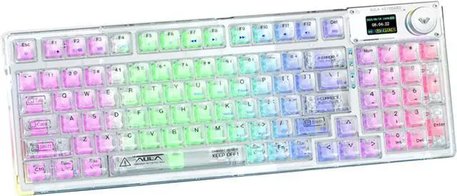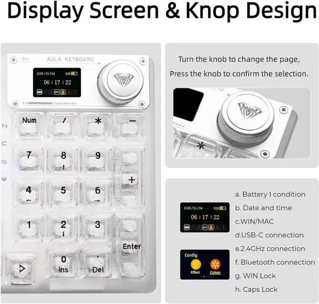 Support for multiple system and device connectionsThe transparent wireless keyboard can quickly switch between Bluetooth 5.0 & 2.4GHz & USB-C connections through a combination of OLED smart screen or hot keys. The keyboard is powered by a 4000mAh battery, and a separate battery compartment is designed so that the battery can be replaced without disassembling the keyboard if you want to replace it with a higher capacity battery. It is compatible with laptops, Windows,and Android. No complicated connections are required, and the OLED smart screen can be easily switched with a knob.