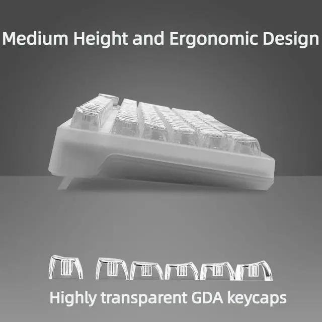 Icy Transparent Keycaps This entire fashionable keyboard is designed with the ultimate in transparency and is made of high quality materials. The transparent shell and keycaps are designed to bring out the keyboard's 19 different south-facing RGB backlights. Even in dark environments, the RGB backlighting appears clear and bright. The keyboard's characters are printed using a proprietary printing process, making it resistant to damage. It features a dual-layered foot support frame and a curved finger-contact design that minimizes fatigue even after prolonged use.