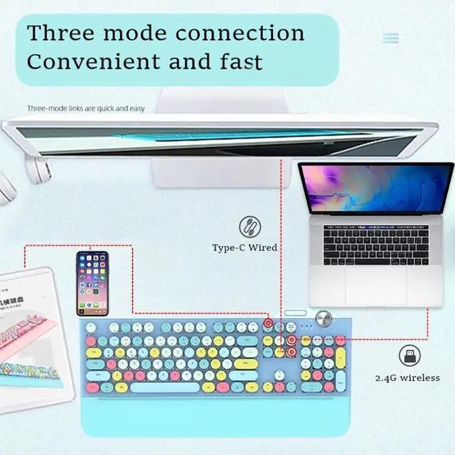 1. Triple Mode: This mechanical keyboard can be easily connected to your PC or device via Type C cable, BT, or 2.4GHz . You can store up to three devices in BT mode, allowing you to switch between tablet, laptop and phone.