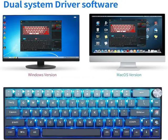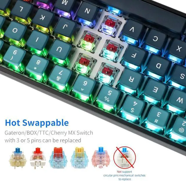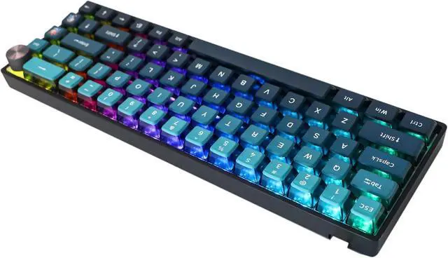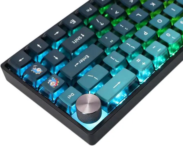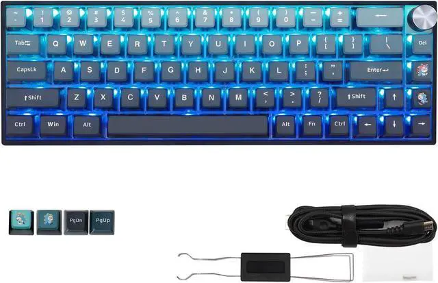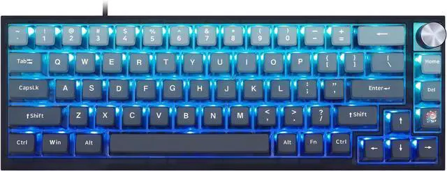 Unique Keyboard ThemeThe 68 keys keyboard mounted with Gradient Cyan on Blue Backlit themed 4-side transparent ASA profile pudding keycaps, with a knob for volume adjustment as a key interspersed at the right top composed a modern and mystery keyboard.