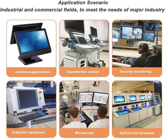 APPLICABLE SCENES: Touchscreen monitor is suitable for industrial and commercial fields, supermarket checkout, security monitoring, industrial equipment, microscope, self service terminal.