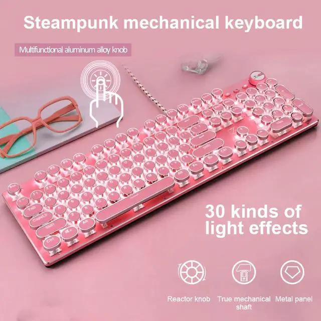 MECHANICAL USB GAMING KEYBOARDWhite colors backlight, Support 30 kinds of stunning LED lighting effects, With the knob, the brightness of the light effect can be adjusted, The Illuminated keyboard has Double-shot injection molded keycaps, It provides transparent and transparent backlight and letters. It is very durable and will not scratch. The perfect mechanical keyboard for office or home use. Mechanical keyboard Include separate number gaming keypad