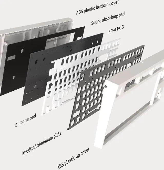 Multi-Layered StackingA structure that fills all space - between the aluminum plate and the PCB wit h a dampener, and stuff sound absorbing material underneath the PCB and the bottom case that makes the sound feedback very bassy when typing.