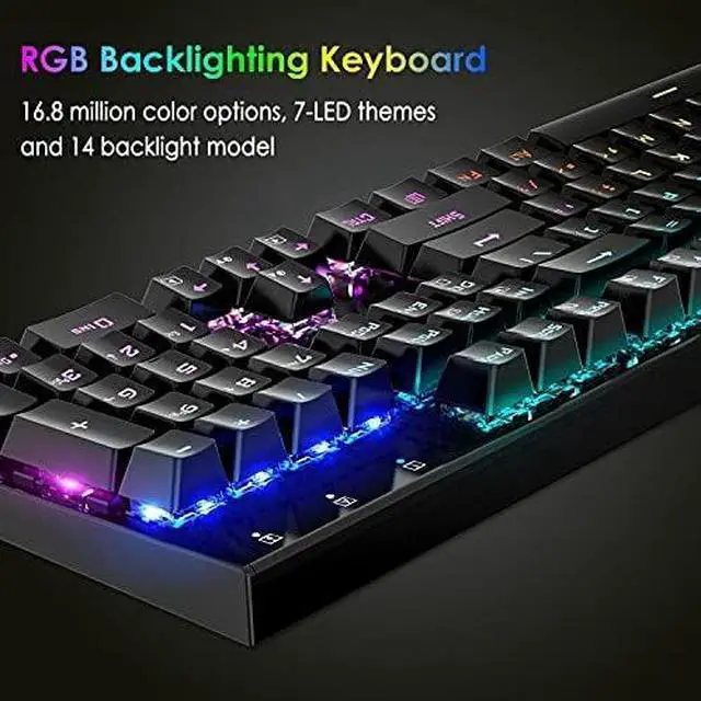 104 Keys Mechanical Keyboard - A backlit, full-sized mechanical keyboard with 104 keys no rush provides smooth and lightweight linear action. Rather than rubber membranes, the mechanical keyboard use Mechanical Switches that underneath each of the keycaps to offer clicky sound, tactility, sturdiness, and the heavy build.