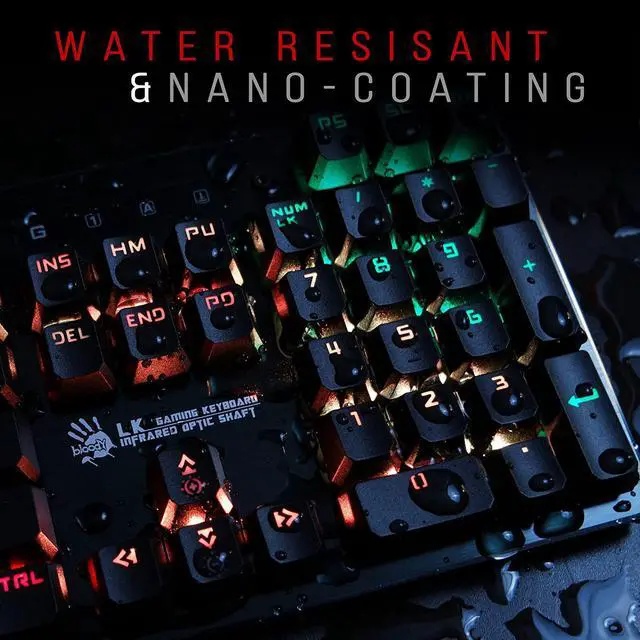 Water Resistant Gaming Keyboard: This optical mechanical gaming Keyboard comes fully nano coated to ensure that even when accidents happen it wont keep you out of the fight. Dedicated drain holes at the back end of the keyboard help liquids flow clearly out of the keyboard housing.