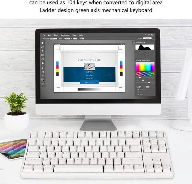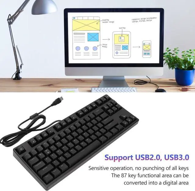 FUNCTION AREA AND NUMBER AREA: The function area of the 87 keys of the wired keyboard can be converted into a number area, and when converted into a number area, can be used as 104 keys (FN+PB=function area and up keys up key change to 1234567890)