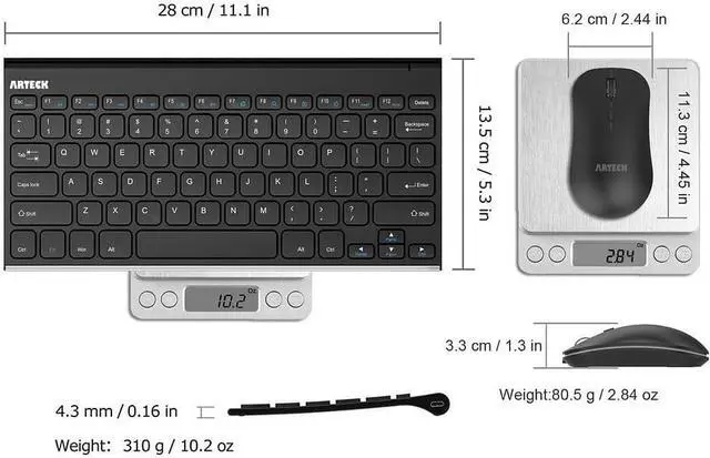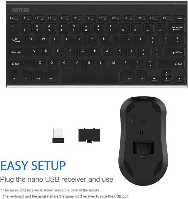 What You Get: Arteck HW086 Wireless Keyboard, MW162 Wireless Mouse, one nano USB receiver for both keyboard and mouse (stored in the back of the mouse), USB charging cable, welcome guide, our 24-months warranty and friendly customer service.