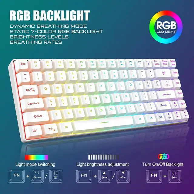 LED Backlit Light Up Keyboard and MouseThe K84 gaming keyboard has built-in 3 groups of rainbow backlight effects, supports 3 static and 1 dynamic breathing mode, 3 brightness levels, and 4 breathing rates for choice. (Note: the light is not RGB, the light color cannot be changed). The mouse has a built-in 7-color cyclic gradual lighting effect.