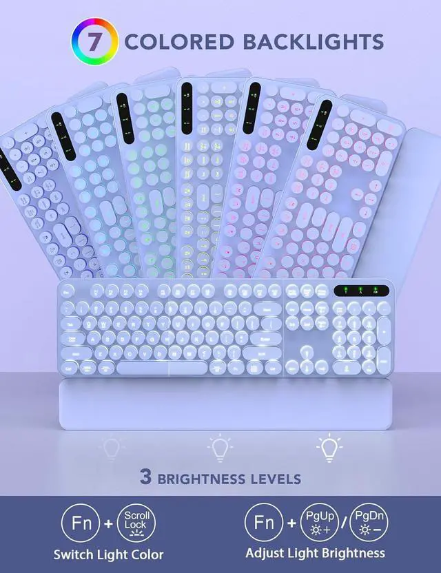 COOL 7-COLOR BACKLIGHT - The wireless keyboard has 7 switchable backlights and an RGB mouse that automatically changes color. Light-up letters help you work better at night and use light effects to improve the atmosphere at workspace.