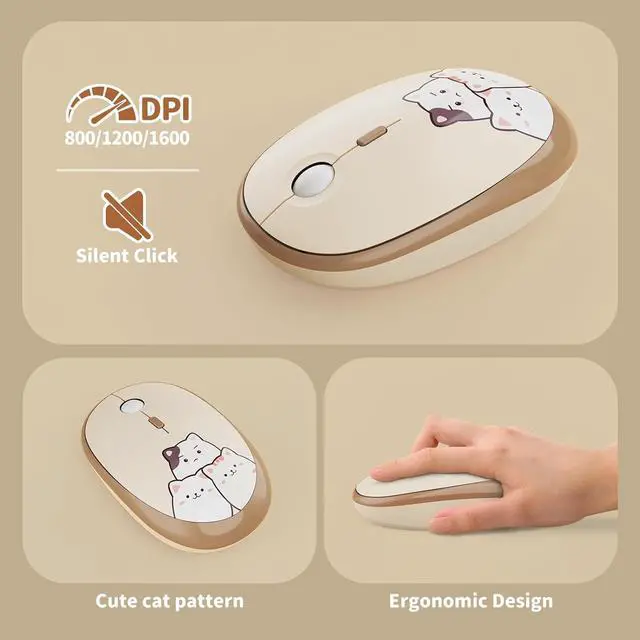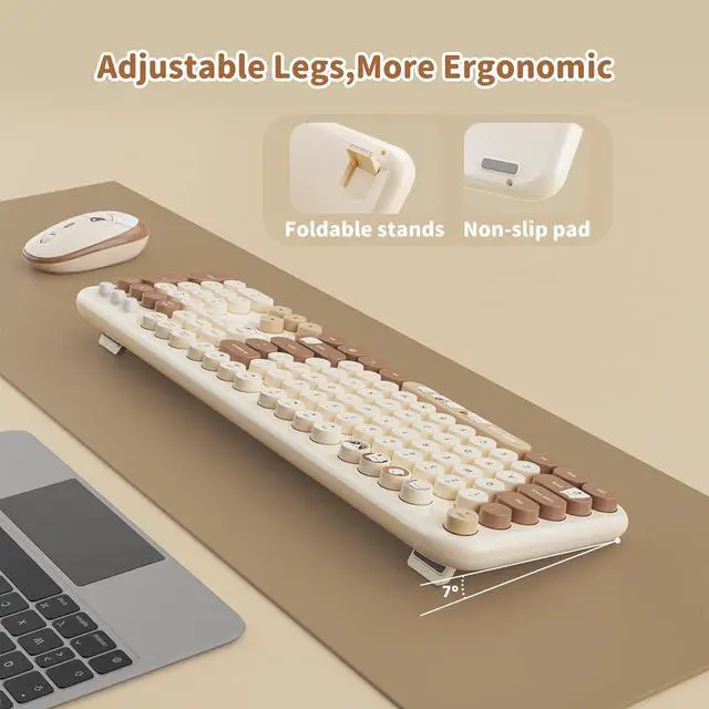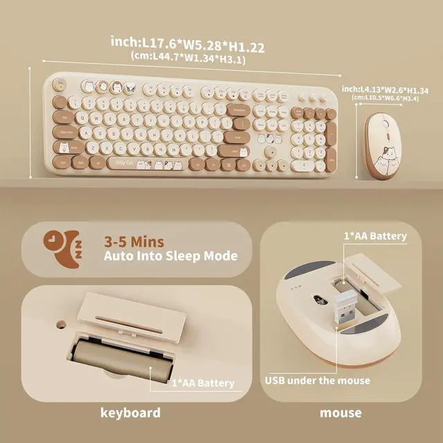 Energy-Efficient & Ergonomic Design: Mouse and keyboard each require 1 AA battery with auto-sleep mode after 5 minutes of inactivity, extending battery life. The keyboards foldable stands allow adjustable typing angles, reducing wrist strain, while the cute mouse fits comfortably in hand.