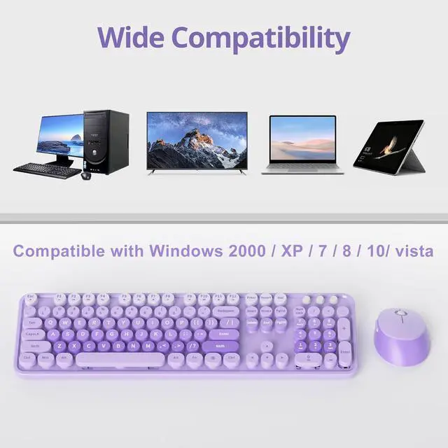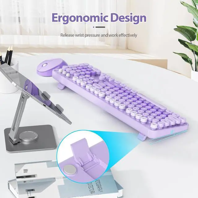 Fogruaden Purple Keyboard and Mouse Wireless, Retro Typewriter Colorful Keyboard Suitable for different surface 3 DPI levels Adjustable Auto-Sleep Mode Easy to Use Multimedia Hot Keys Ergonomic Design Office Keyboard and Mouse 2.4GHz Wireless Connection 104 Full Size Round Keycap Cute Computer Keyboard and Mouse 13 Multimedia Hotkeys for One-Touch Commands to Enhance Your Productivity Easy-to-Clean Removable Keycaps Package included 1 AA battery for Keyboard 1 AA battery for Mouse