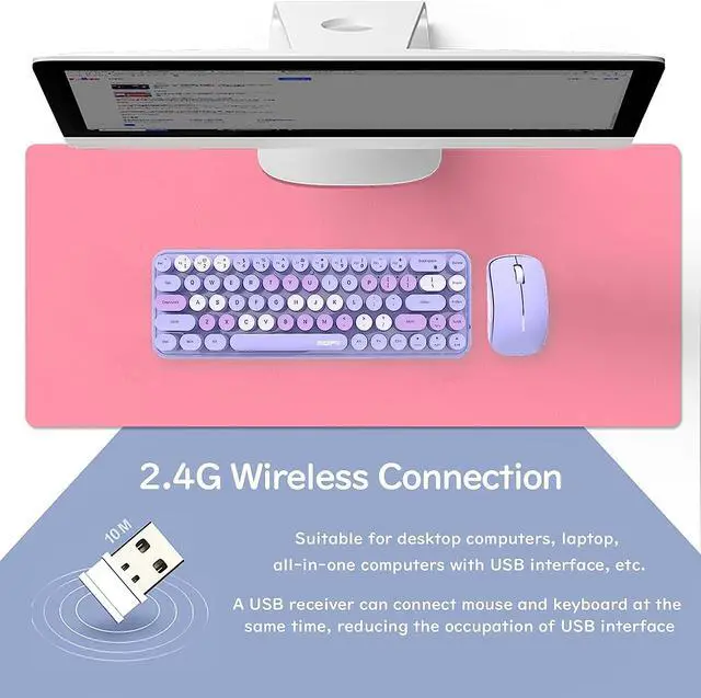Wireless connection2.4G wireless transmission technology, the maximum transmission distance can reach 10m. The wireless connection solves the desktop clutter problem caused by the data cable, suitable for those who like to have a neat desktop. One USB receiver can connect the mouse and keyboard at the same time, reducing the occupation of the USB interface.