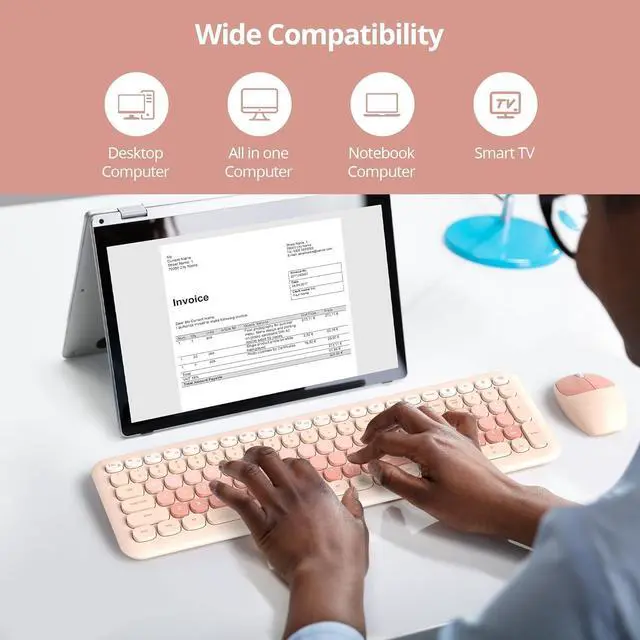 Quiet Tapping and Click: This aesthetic flat wireless keyboard and mouse combo is designed for noise reduction, making it perfect for use in offices, homes, or public areas without affecting others. Reduceing click noise by 70% when tapping buttons. The exceptionally silent mouse can reduce 98% of clicking noise, ensuring a quiet environment