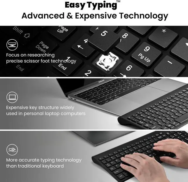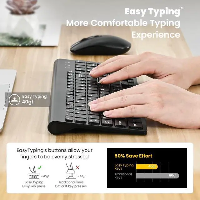 Ultra-Slim and Ergonomic Design: EasyTyping Slim keyboard design layout is compact, wrist motion range is only 8%, so that your wrist motion range is greatly reduced, and ergonomic tilt angle effectively reduces typing fatigue, protects your health