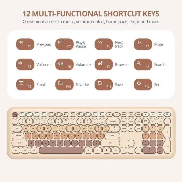 Multimedia Hotkeys: Equipped with 12 multimedia function keys, this cute colorful keyboard allows easy control over music, video playback, and web browsing, enhancing productivity and convenience