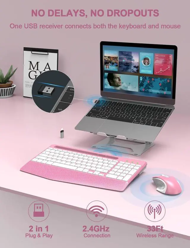 LAG-FREE, ENJOY WIRELESS FREEDOM: Plug and play, no need to install drivers, the keyboard and mouse combo shares the same USB receiver. Upgraded chips and 2.4 GHz wireless provides a powerful and reliable connection up to 33 feet without any de