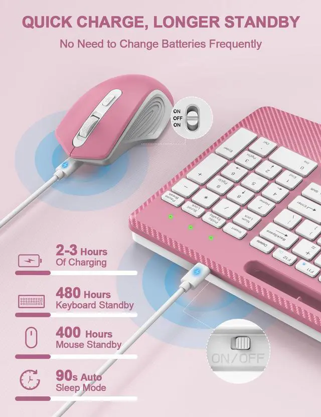 RECHARGEABLE & SMART ENERGY SAVING: The wireless mouse keyboard are equipped with rechargeable 500mAh and 1000mAh lithium battery respectively, they provide up to 2-3 months of usage on one charge, say goodbye to the hassle of battery replacements