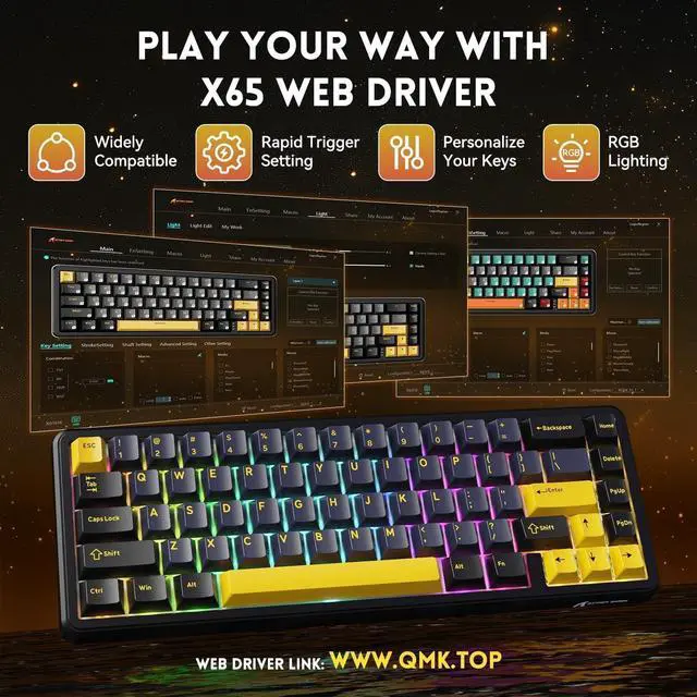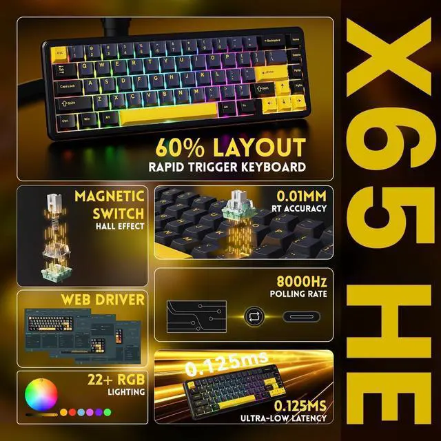 RT Keyboard with Adjustable ActuationThis X65HE series adopt advanced rapid trigger tech, offer an adjustable actuation distance ranging from 0.1mm to 3.4mm with 0.01mm precision, resetting keys instantly for fast, uninterrupted inputs, providing lightning-fast response times to maintain a competitive advantage in intense matches, ensuring an unparalleled experience whether it's rapid shooting or complex combo actions, perfect for FPS,RTS, and MOBA games where every millisecond counts
