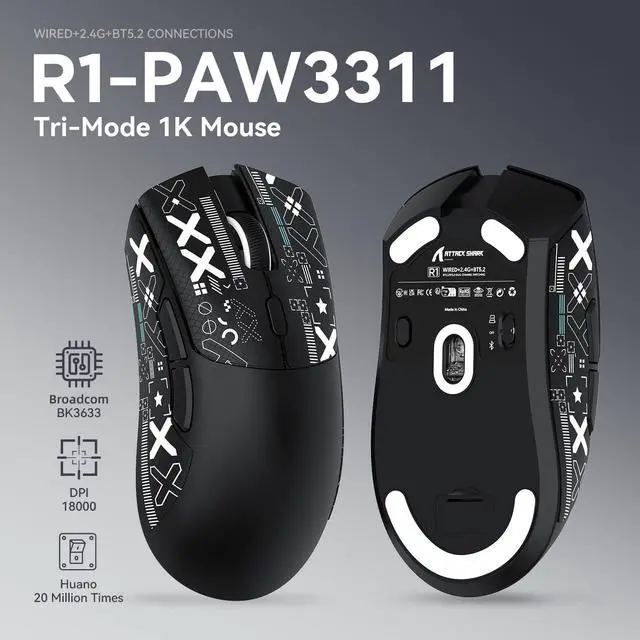 Ultralight Gaming Mouse with High End Optical SensorThe R1 mouse can offer 3 connection mode-type-C wired/2.4Ghz wireless/Bluetooth, equipped with PAW3311 sensor which provides the best gaming experience with the enhanced features of high speed,high resolution,high accuracy.With exceptional accuracy and responsiveness thanks to 400 IPS precision and up to 18000 DPI sensitivity.Furthermore, it can convince with an acceleration of 40G and 1000Hz high polling rates