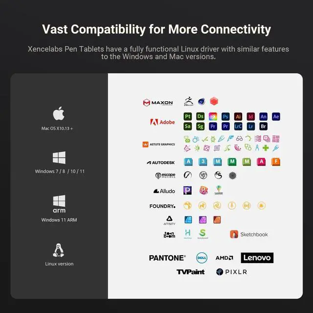 Easy installationXENCELABS Pen Tablet is a perfect combination of input device and driver which work together to create an intuitive and natural drawing experience. Convenient and easy to use, effortlessly syncing to your Operating System. Drawing tablet supports: GIMP, Krita, Inkscape, Adobe Photoshop, Illustrator, ArtRage, Sketchbook, Substance Painter, and more.