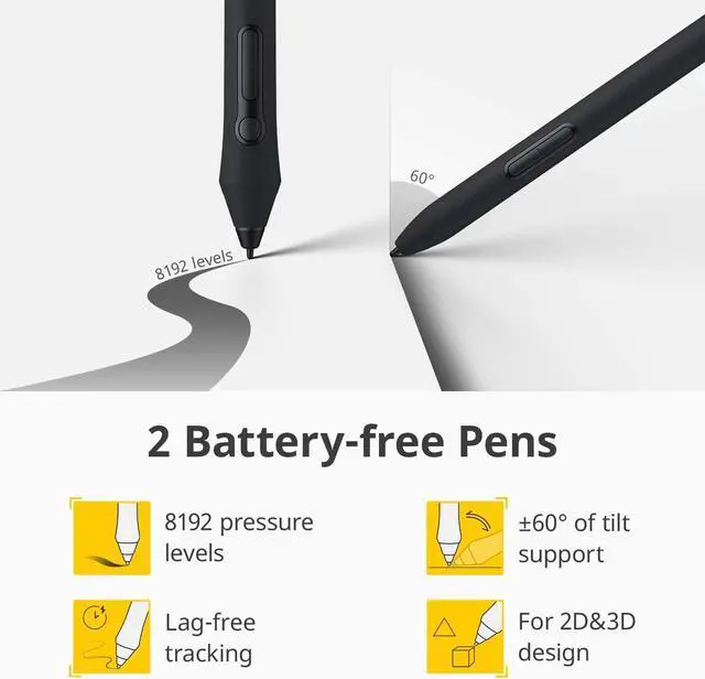 2 Battery-free Pens,Natural Pen Experience8192 levels of pressure sensitivity, 5080LPI pen resolution and virtually no lag to provide the most ultimate precision and control performance.The digital pen features two different diameters and number of buttons to adapt to different drawing methods and effects and give you the familiar pen-on-paper feel for drawing and creating.