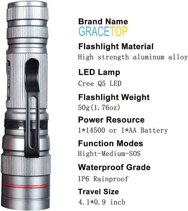 Flashlight Dimensions: 3.5"(L) x 1" (Head Dia.) x 1" (Body Dia.) (6.20" Full extension length (zoom function))