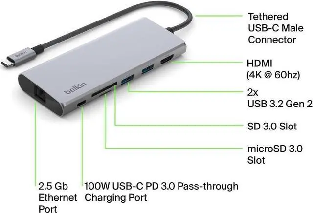 2-YEAR WARRANTY: This Belkin USB-C hub comes with a 2-year limited warranty and a Connected Equipment Warranty (CEW) of up to $2,500, so you can rest assured that your adapter and other devices are safe and protected