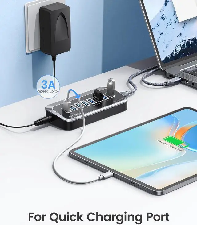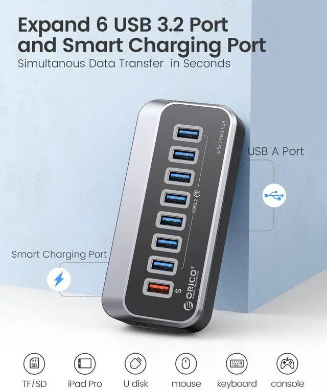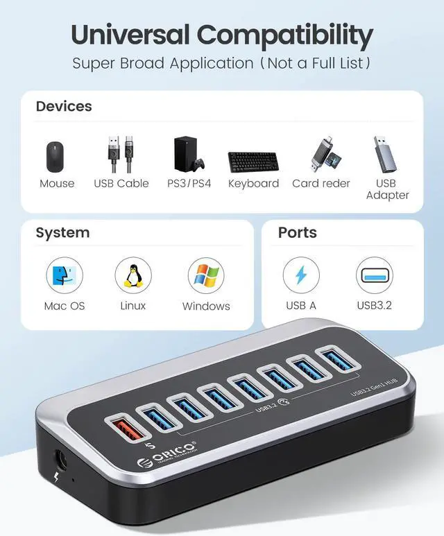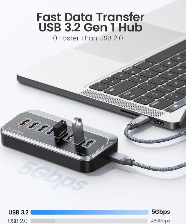 USB 3.2 data hub 4/7 Ports supports super faster data transfer up to 5Gbps - 10X faster than USB 2.0 (480 Mbps), which allows you to transfer HD movies or large files in just seconds, and it is compatible with Windows XP / Vista / Win 7 / Win 8 / Win 10, Mac OS 10, Linux and above, backward compatible with USB 2.0 connections.