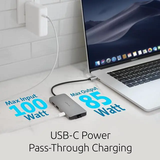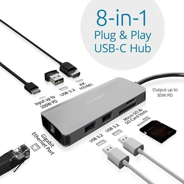 Supports up to 85W poUSB C hub With HDMI - USB-C driverless solution, no need to download, install, or update software this USB-C plug-andplay solution provides eight ports of connectivitywer pass-through, use your USB-C power supply to quickly and easily charge any USB-C enabled laptop (laptop must support Power Delivery).Optional Kensington 100W Power Adapter (K33821) sold separately