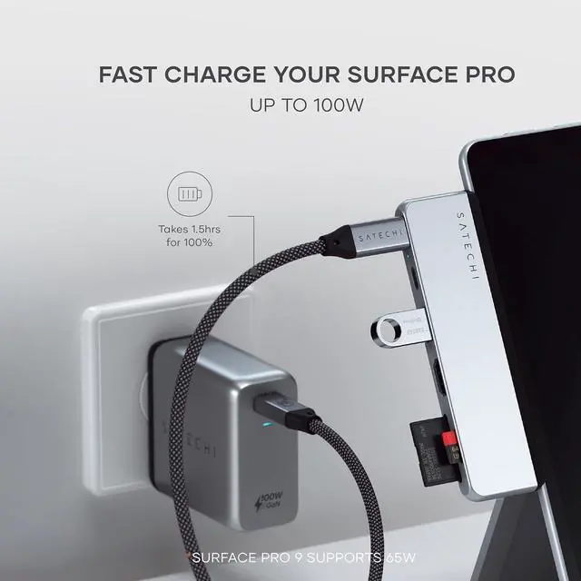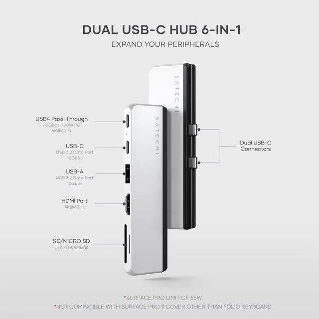 Powerful Ports The Satechi Dual USB-C Hub attaches seamlessly onto your Surface Pro 9 to add an extension of 6 powerful ports including a USB4 pass-through port, USB-C and USB-A 3.2 Gen 2 Ports, both at 10Gbps, HDMI 2.0 Port, and SD, microSD UHS-I card slots. The USB4 pass-through port on this Microsoft Surface Pro docking station can support up to 100W Power Delivery, 6K video output, and 40Gbps transfer speeds.
