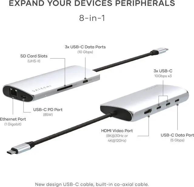 Satechi 8 in 1 USB C Hub Multiport Adapter V3, 8K HDMI, 100W Charging, 4 USB Data Ports, Ethernet, SD Card Reader, for Laptop, for Mac/Windows, MacBook Air/Pro M5/M4, iPad - Silver