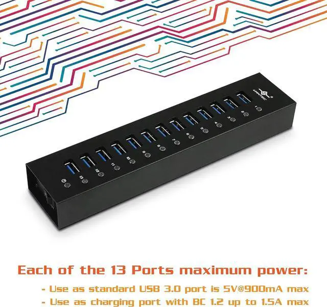 Simultaneously Power for all 13 USB 3.0 ports (Total power used may not exceed 52 watts); Each of the 13 Ports maximum power: Use as standard USB 3.0 port is 5V@900mA max; Use as charging port with BC 1.2 up to 1.5A max