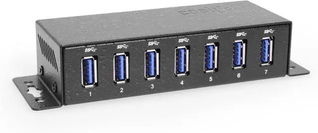 Surface Description Introduction: USB 3.2 Gen 1 powered hub with industrial-grade chassis and surface mounting flanges. The CG-U3MINI7PH is a 5V DC input, generation 1 USB 3.2 Gen 1 hub with ESD and Surge protection. This USB 3.2 Gen 1 Hub will support fast charging for Apple and Samsung Galaxy devices. Each port is protected individually to help keep your peripherals safe. The USB 3.2 Gen 1 Hub uses a GL 3510 chip, each port is on an individual circuit to maintain high current and protection. The GL3510 Hub controller chip features native fast-charging and complies with USB-IF battery charging specification rev 1.2.