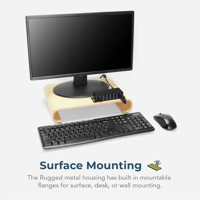 Package Contents: USB 3.2 Gen 1 7-Port Hub 6 Amp 5V DC Mini-Switching Power Adapter 3ft. USB A to B Cable for Hub *Surface Mounting screws not included.