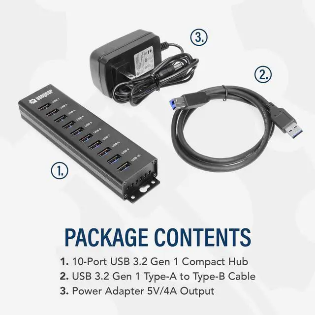 Package Contents: 10-Port USB 3.2 Gen 1 Compact Hub, USB 3.2 Gen 1 Type-A to Type-B Cable, Power Adapter 5V/2A Output, 100-240V, 50/60Hz 0.40A