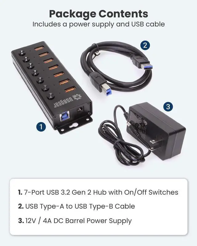 7-Port USB 3.2 Gen 2 Hub - 10Gbps, Individual Power Switches, and Mountable Design for Workspaces & Labs