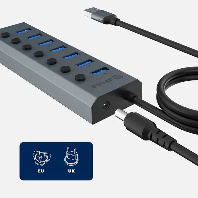 [Empowered Connectivity] - Stable DC 5V connection, eco-friendly design, and convenient control in our USB hub with UK and EU adapters.