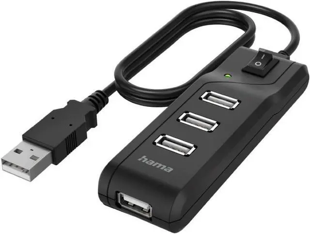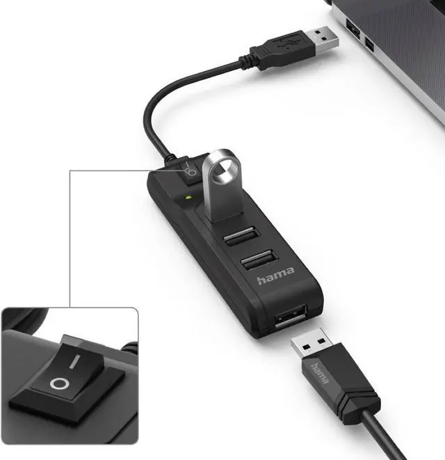 Switchable adapter: hub with switch can be switched on and off and thus allows energy-saving use of the connected devices