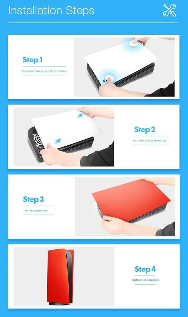 Easy Installation And Removal: This PS5 console protective cover's replacement steps are simple, allows everyone to easily install & remove it; Disassembly: slide in the direction of the logo and lift original cover up slightly, you will get the removed console cover within 1 second; Installation: operate the reverse operation of disassembly, then you will get a PS5 console cover color as you like