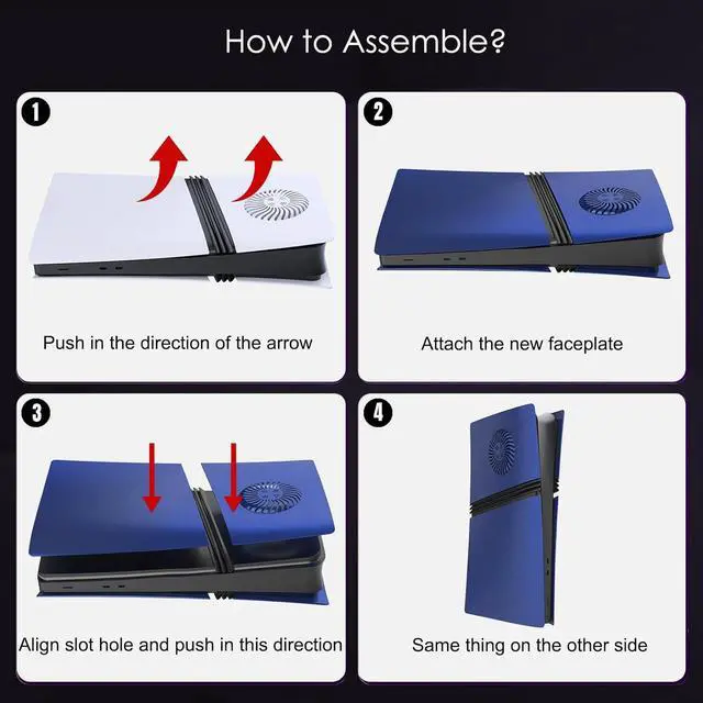 Simple Snap-On Installation & Removal: Installing or swapping your PS5 Pro Digital cover is quick and hassle-free; Just align the snaps with the console's holes and slide it into place (follow the arrow direction); Removal is just as easy, No tools needed!