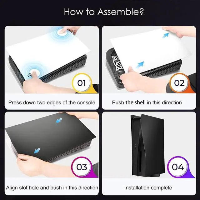 Easy Installation And Removal: This PS5 console protective cover's replacement steps are simple, allows everyone to easily install & remove it; Disassembly: slide in the direction of the logo and lift original cover up slightly, you will get the removed console cover within 1 second; Installation: operate the reverse operation of disassembly, then you will get a PS5 console cover color as you like