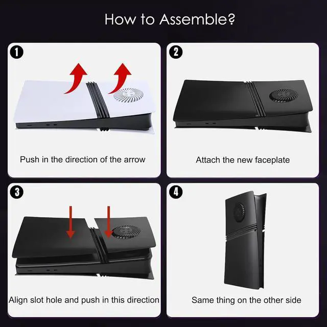 Simple Snap-On Installation & Removal: Installing or swapping your PS5 Pro Digital cover is quick and hassle-free; Just align the snaps with the console's holes and slide it into place (follow the arrow direction); Removal is just as easy, No tools needed!