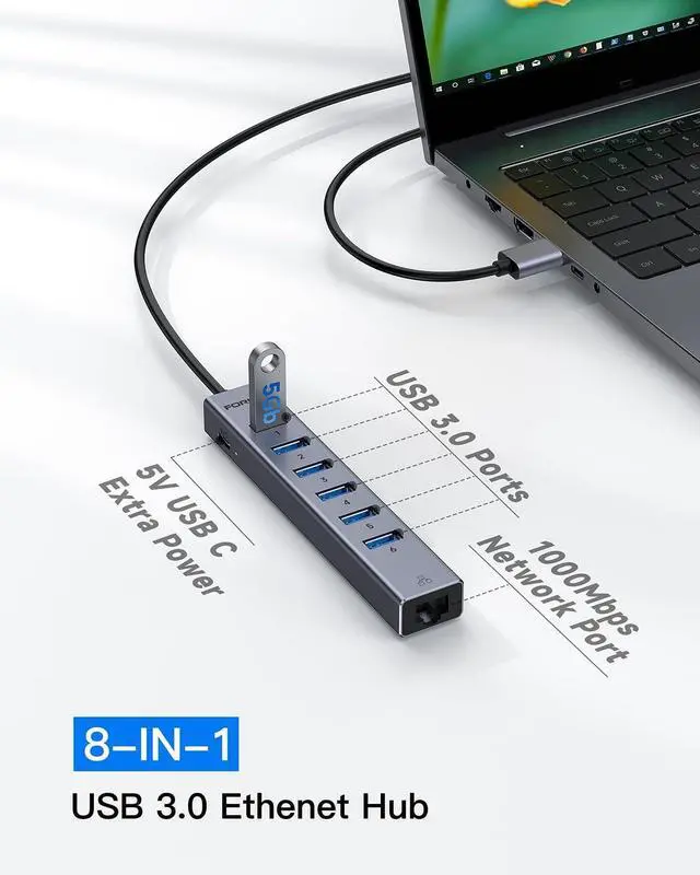 8-IN-1 USB HubThis USB3.0 hub can instantly expand 1 USB A port into 8 ports, including 6*USB 3.0 , 1 * USB C 5V charging port and 1 * Gigabit ethernet port . No more worry about inadequate USB ports.