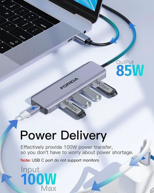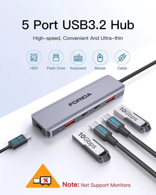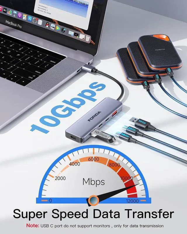 10Gbps Superspeed Data Transfer : FORIDA USB C to USB hub is equipped with 2 USB-A 3.2 and 2 USB-C 3.2 ports, data transfer speed up to 10Gbps, fast enough to transfer files and pictures in seconds.NOTE: USB 3.2 port only supports data transmission, does not support video output and charging functions.
