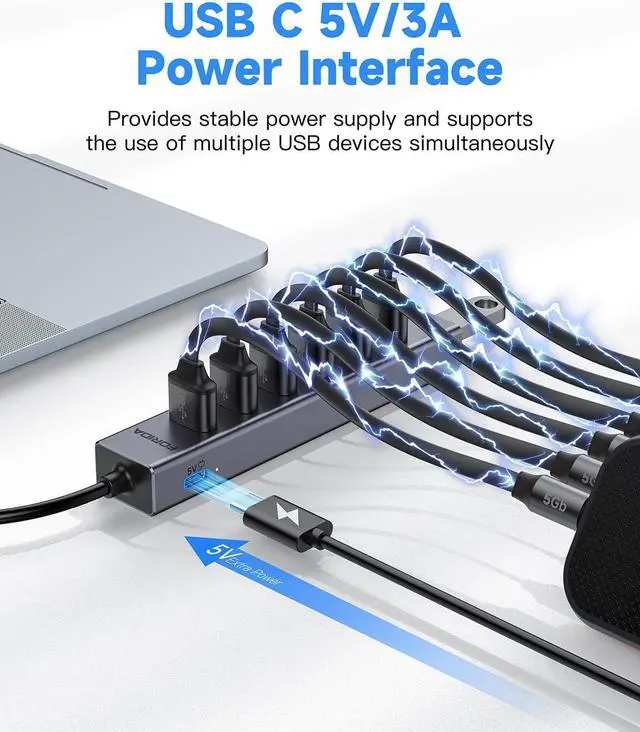 Smart Charging Port : The USB 3.0 hub comes with an additional USB C 5V/3A power interface, which can provide up to 12W charging power. When you use multiple USB 3.0 interfaces at the same time, you don't have to worry about device delays and insufficient power caused by insufficient voltage.