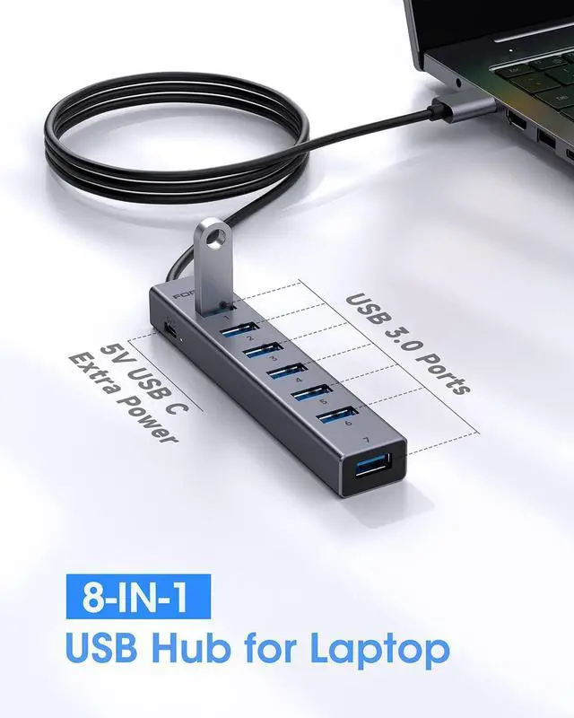 8-IN-1 USB Hub : This USB 3.0 hub can instantly expand 1 USB A port into 8 ports, including 7 USB 3.0 , 1 USB C 5V charging port. No more worry about inadequate USB ports.